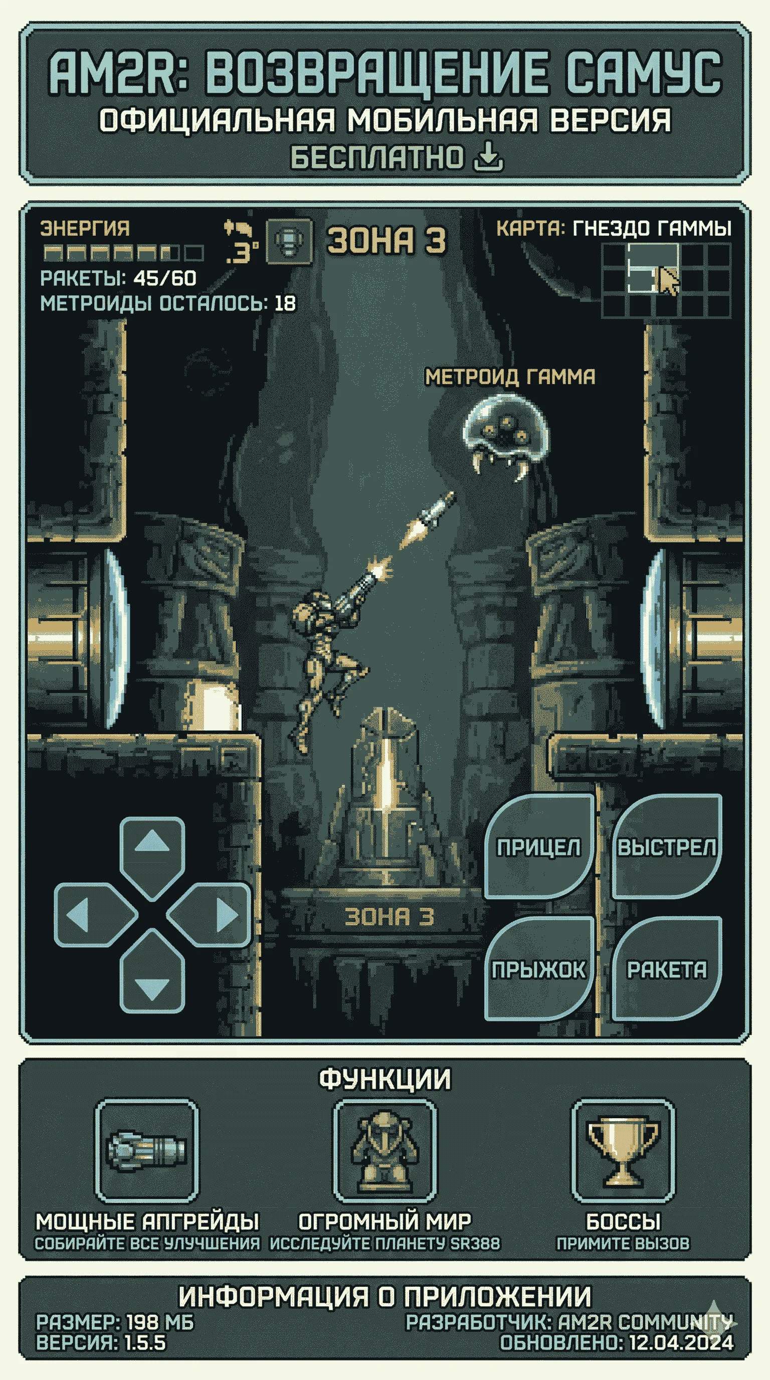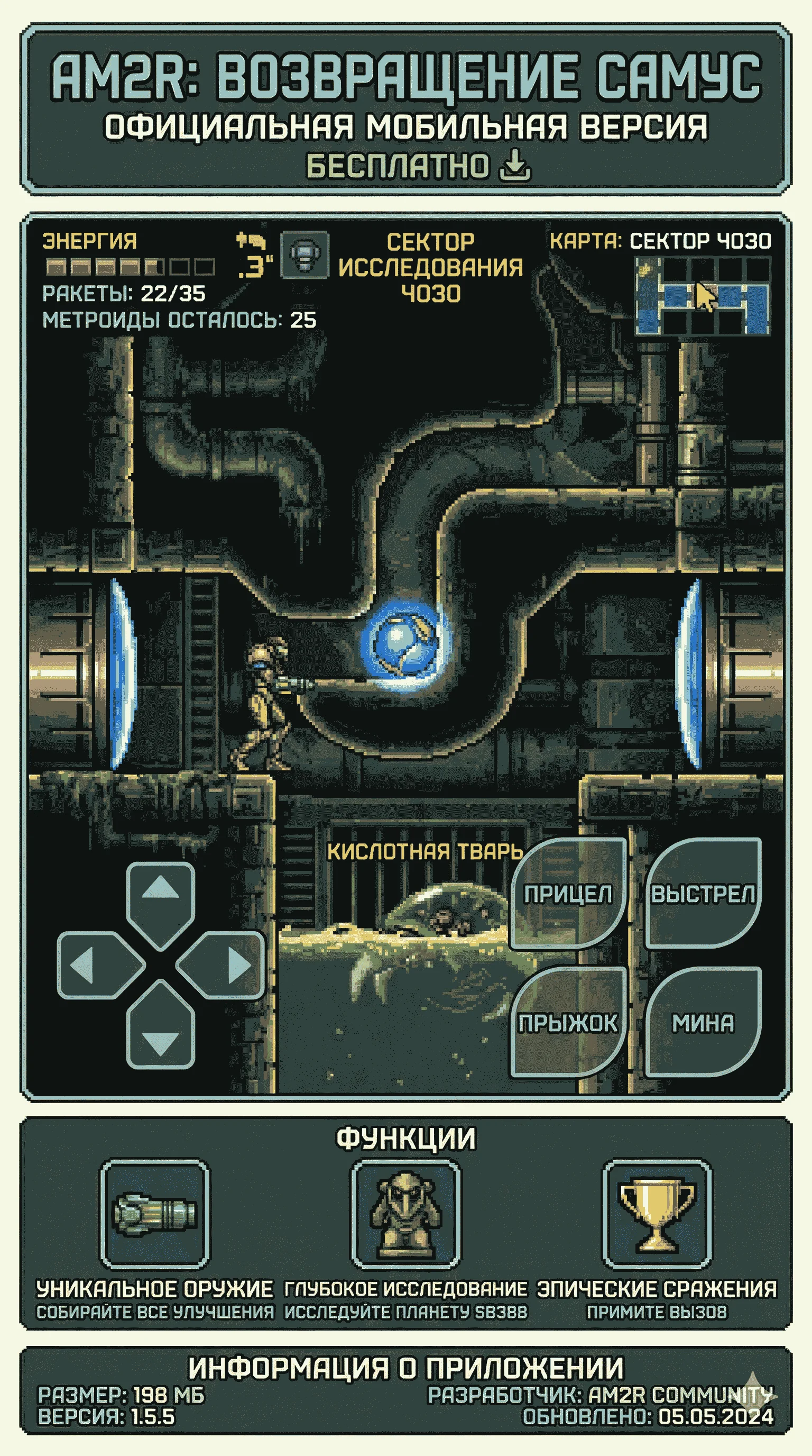 В мире видеоигр существуют уникальные проекты. Они создаются не ради коммерческой выгоды крупных корпораций, а из чистой любви преданных фанатов к первоисточнику. AM2R (Another Metroid 2 Remake) — именно такой случай. Перед нами монументальный труд, создававшийся на протяжении долгих лет. Разработчик не просто освежил классическую игру эпохи Game Boy, он возвел ее в абсолют, сделав одной из лучших представительниц жанра на сегодняшний день. Если вы искали возможность погрузиться в эту невероятную атмосферу прямо на своем мобильном устройстве — вам крупно повезло. Загрузить установочный файл можно прямо на этой странице.